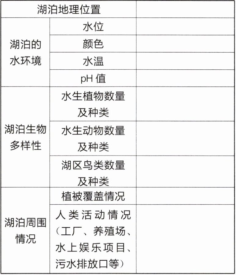 2. 请查阅相关资料,实地走访,考察家乡湖泊的生态环境,完成调查表(表 2 - 6)的填写。(也可以另外设计表格)