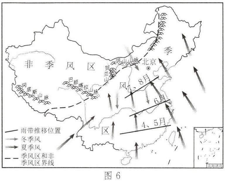 每年我国东部雨带有规律地南北移动。雨带一般4月在华南登陆,随夏季风增强逐渐北移,9月迅速南撤,10月退出大陆。图6为中国季风的进退与雨带推移图。读图,完成12~13题。