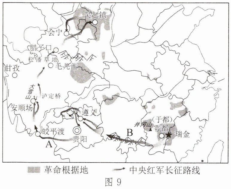 材料 2024年是中央红军长征出发90周年。毛泽东曾写下《七律·长征》一诗来歌颂红军不怕困难、百折不挠、勇往直前的革命精神和乐观主义精神:“红军不怕远征难,万水千山只等闲。五岭逶迤腾细浪,乌蒙磅礴走泥丸。金沙水拍云崖暖,大渡桥横铁索寒。更喜岷山千里雪,三军过后尽开颜。”图9为中央红军长征路线示意图。