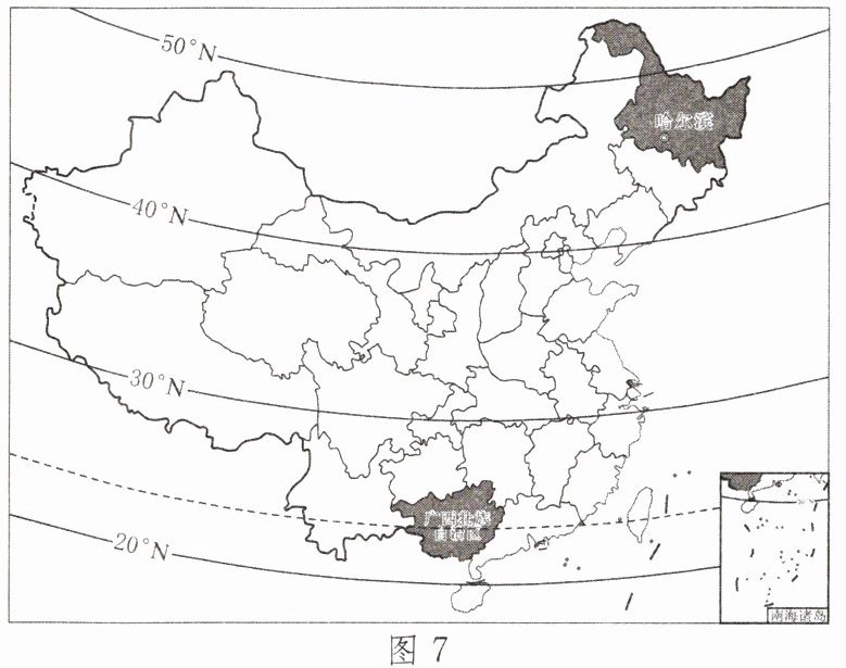 哈尔滨地处我国东北地区,是黑龙江省的行政中心。哈尔滨冬季旅游异常火爆,南方游客纷纷前往哈尔滨体验冰雪风情。图7为广西和哈尔滨位置示意图。读图,完成14~15题。