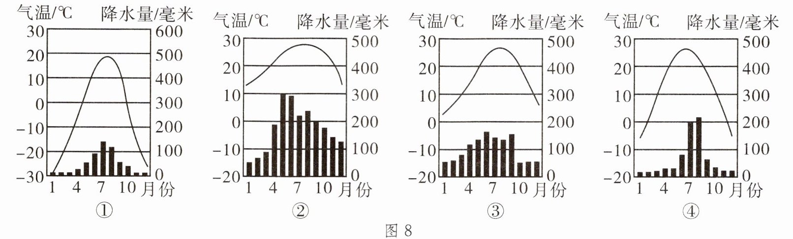 15. 根据材料,图8中符合哈尔滨气候特征的气温年变化曲线和逐月降水量图的是( )。