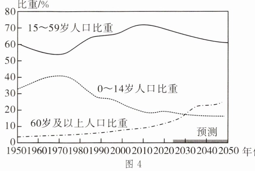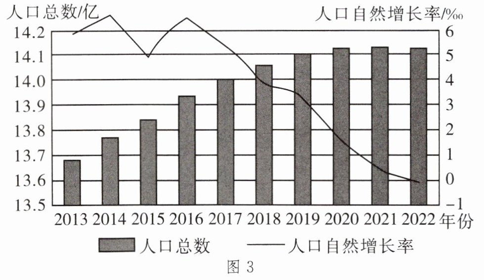 近年来,我国人口发展出现了一些显著变化,既面临人口众多的压力,又面临人口结构转变带来的挑战。图3为2013—2022年中国人口变化趋势图,图4为中国不同年龄人口比重变化示意图。读图,完成6~7题。