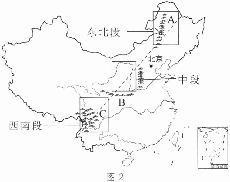 某旅游团将组织游客走“胡线”(即“胡焕庸线”)漫步中国,该旅游路线分成东北段、中段、西南段(如图2)。读图,完成4~5题。