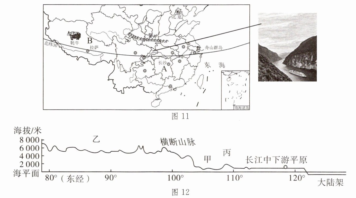 (2)摄制组沿途拍摄了长江三峡之一的巫峡景观,巫峡是由长江深切巫山形成的大峡谷。巫山位于图12中甲、乙、丙三地中的______地。