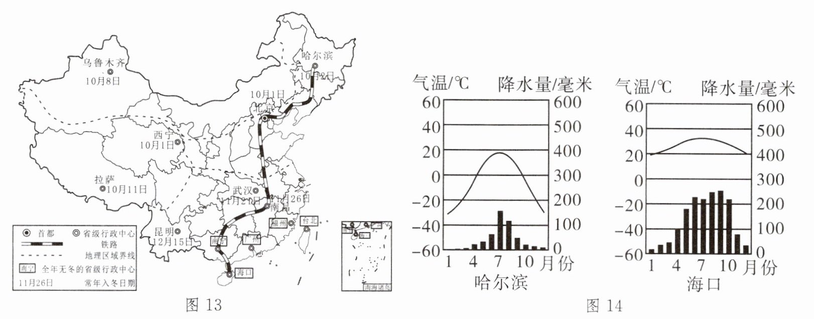 材料 随着我国经济的快速发展,人民的生活水平不断提高,很多老年人过起了候鸟式的生活。冬季来临之际,许多北方老年人便打点行装,选择去气候温暖的城市躲避严寒。夏季到来之时,这些老年人则前往凉爽干燥的北方,享受宜人的气候和自然环境。图13为中国部分城市常年平均入冬时间及哈尔滨—海口“越冬专列路线”图,图14为哈尔滨与海口的气温年变化曲线和逐月降水量图。