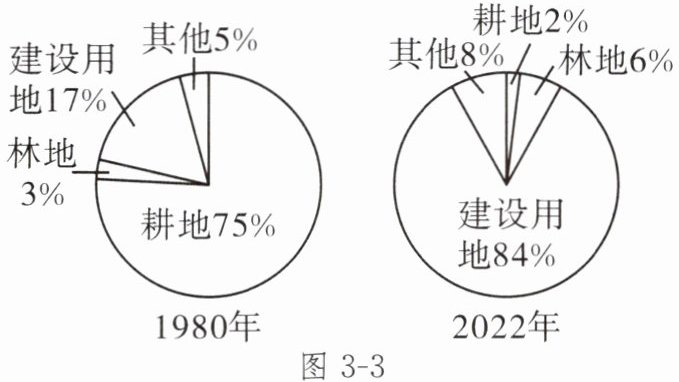 某中学的学生地理社团,对学校附近某村的土地利用情况进行了调查,并绘制了该村土地利用类型统计图(如图 3 - 3)。读图,完成 3~5 题。