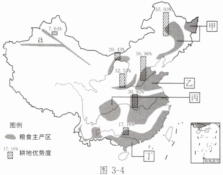 6. 甲、乙、丙、丁四个粮食主产区中,耕地优势度最大的是( )。