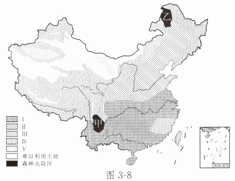 (2023 年江苏镇江)土地是立国之本,我国土地利用类型分布很不均衡。图 3 - 8 为我国主要土地利用类型分布及某日森林火险气象预报示意图。读图,完成 1~4 题。