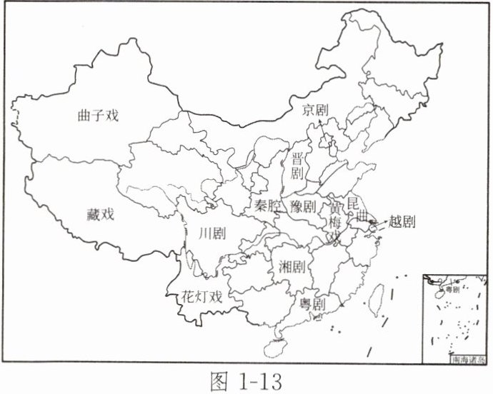 《2025 年春节联欢晚会》的国风节目惊艳了众人,从戏曲联唱到古典舞韵,充分展现了中国传统文化的魅力。图 1 - 13 为中国部分传统戏剧分布图。读图,完成 1 ~ 3 题。