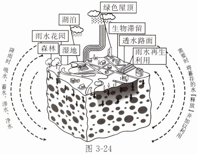 我国大力推进雨水自然积存、自然渗透、自然净化的海绵城市建设。图 3-24 为海绵城市示意图,图 3-25 为我国海绵城市建设试点城市分布图。读图,完成 1~3 题。