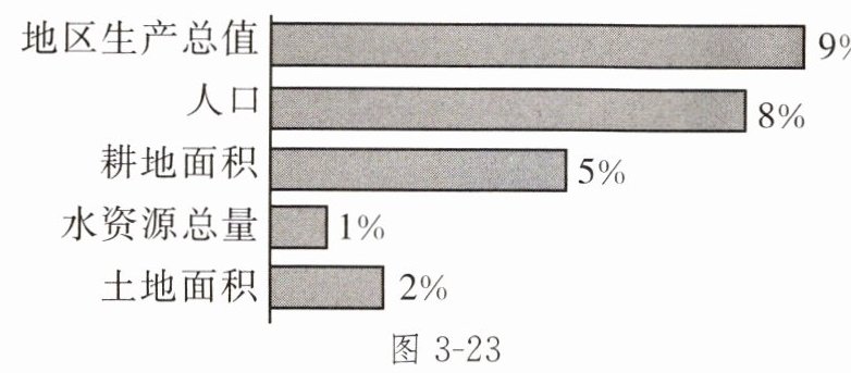 (2) 读图 3-23,比较京津冀地区水资源总量和土地面积占全国的比重,从水资源占有量的角度分析京津冀地区水资源短缺的自然原因。
