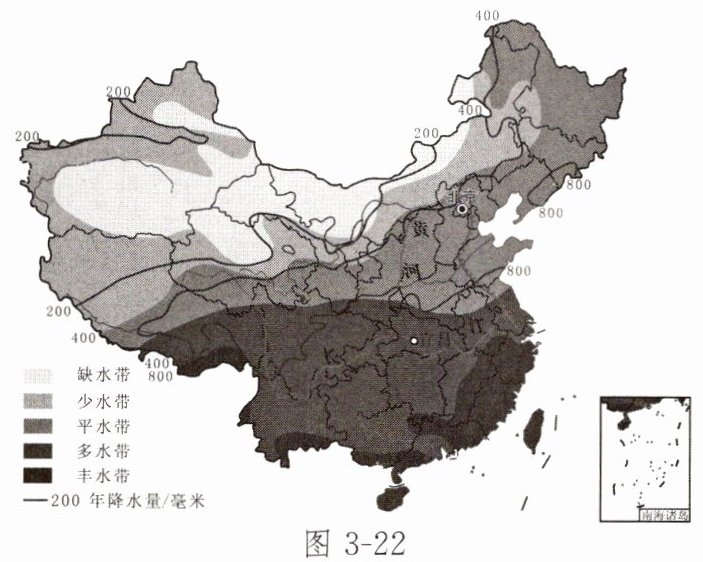 (1) 读图 3-22 可知,我国水资源的地区分布特点是______。广西所在的径流带是______。