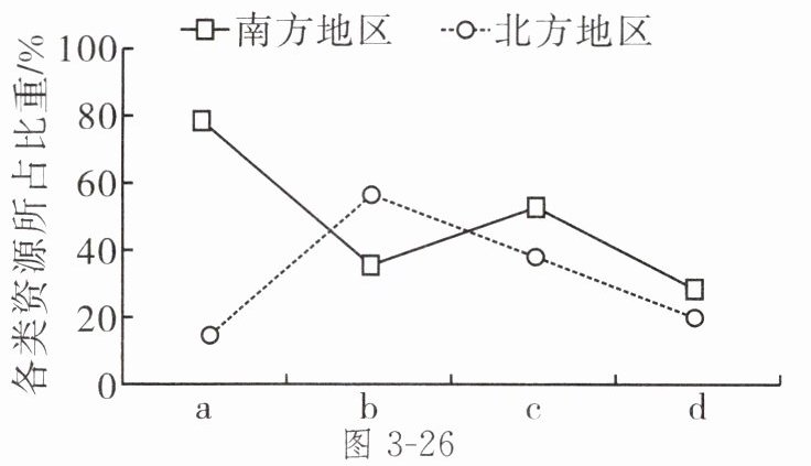 (2024 年四川广安) 图 3-26 为中国南方地区和北方地区土地面积、水资源总量、人口及耕地等指标对比图。读图,完成 1~2 题。