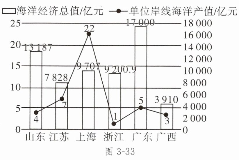 中国是一个海洋大国,海洋面积相当于陆地面积的 1/3,建设海洋强国是中国特色社会主义事业的重要组成部分,以海洋产业为代表的蓝色经济正在成为拉动中国经济增长的新引擎。图 3 - 33 为 2020 年部分沿海省级行政区海洋生产总值及单位海岸线产值图。读图,完成 1 ~ 3 题。