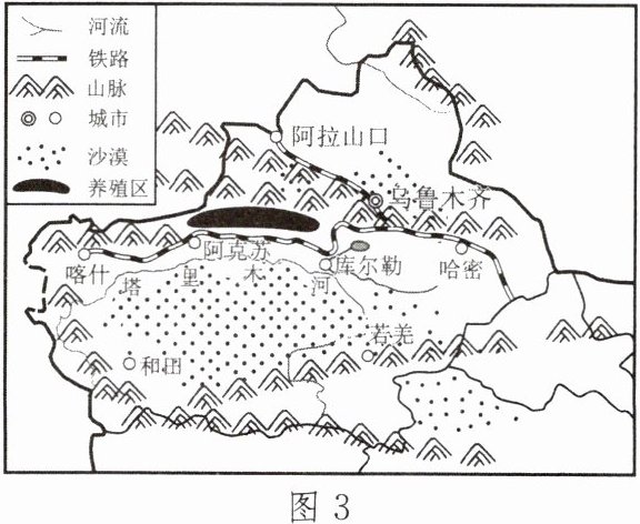 深居内陆的新疆,通过“海鲜陆养”模式,将盐碱水变成“人造海水”,迎来海鲜大丰收。图 3 为新疆海鲜养殖区分布示意图。读图,完成 4~6 题。