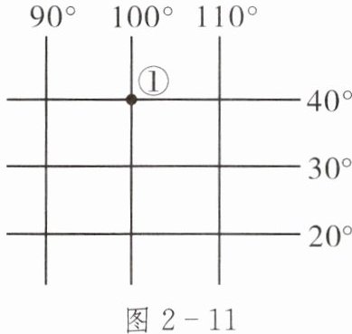 酒泉卫星发射中心位于甘肃酒泉东北(图 2 - 11 中①点所在位置附近),是中国建设最早的航天器发射试验基地。读图,完成 7~8 题。