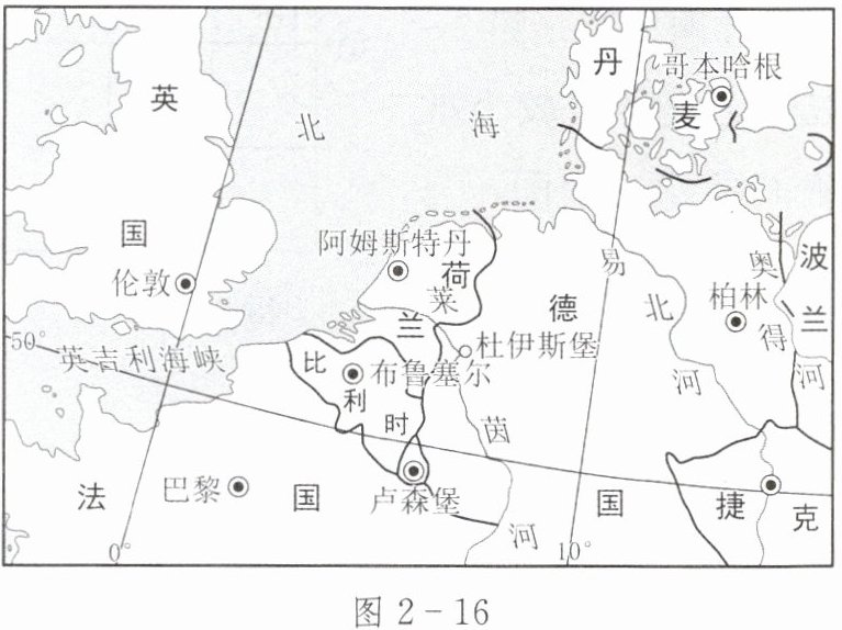 (2023 年湖北荆州)杜伊斯堡位于欧洲经济的心脏地带,是中欧班列运行班次最多、运量最大和货值最高的欧洲枢纽。图 2 - 16 为欧洲西部局部地区示意图。杜伊斯堡的经纬度位置大致是( )。