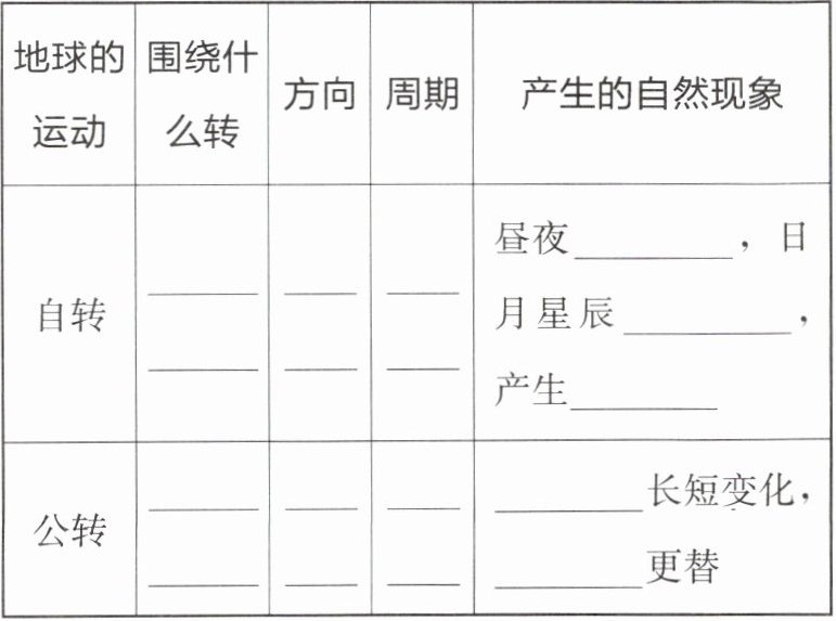 |自转|____|____|____|昼夜____,日月星辰____,产生____|
