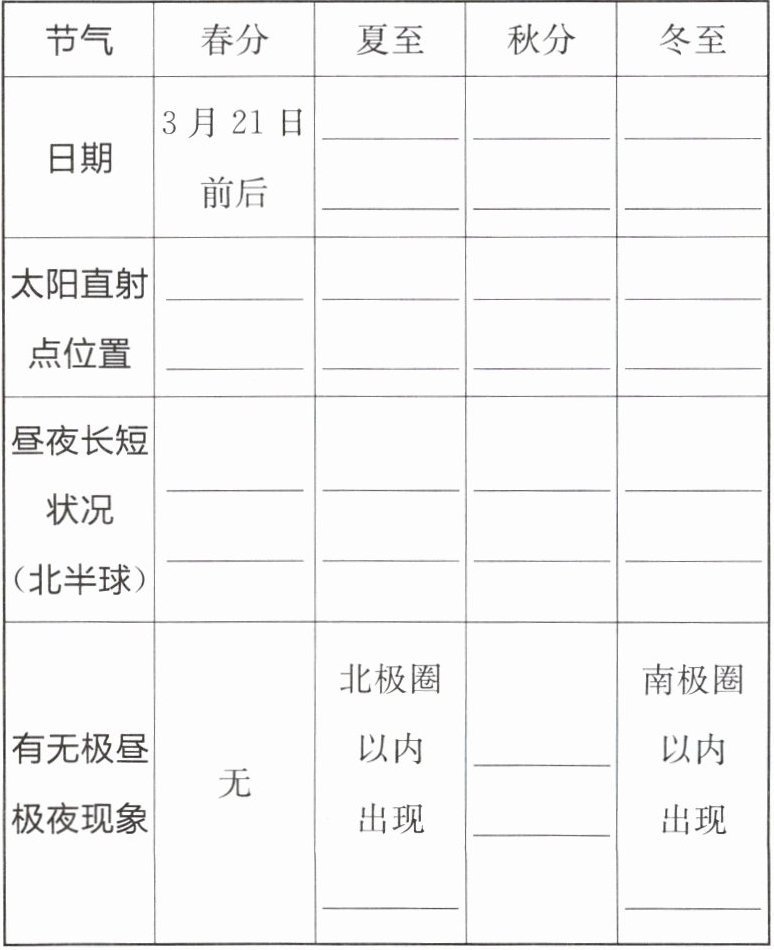 |有无极昼极夜现象|无|北极圈以内出现|____|南极圈以内出现|