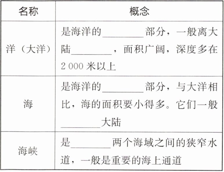 |洋(大洋)|是海洋的______部分,一般离大陆______,面积广阔,深度多在2000米以上|
