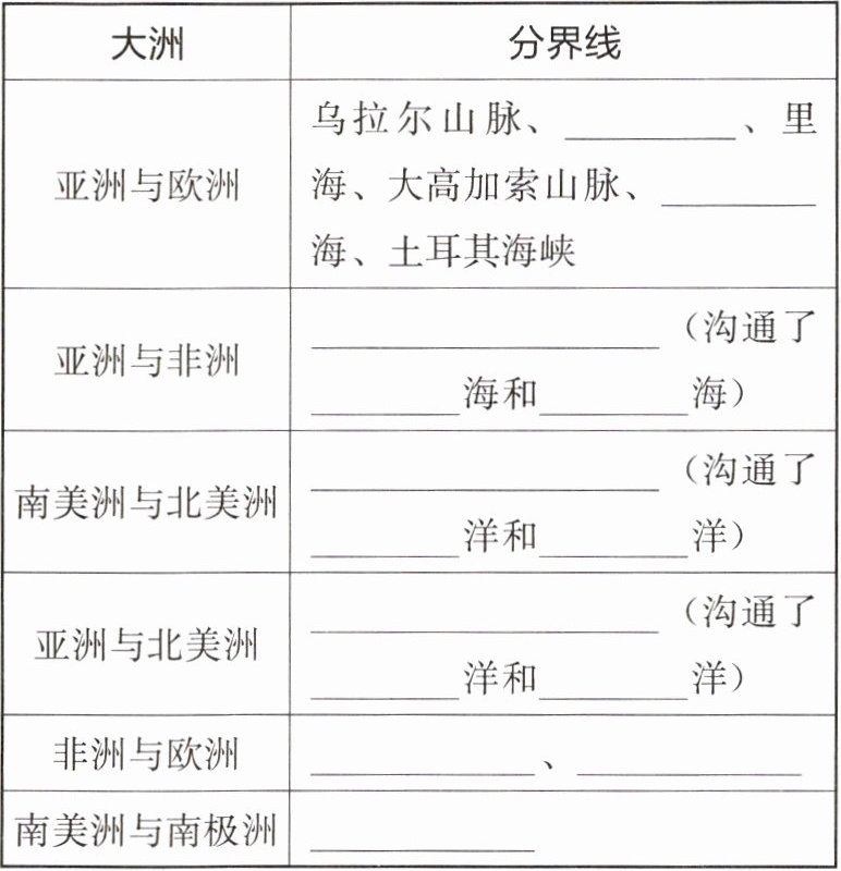 (1)非 大洋 欧 亚 北美 南极 南美 (2)①亚洲 非洲 ②北美洲 南美洲 ③南美洲 亚洲 ④南极洲 ⑤欧洲 北美洲 ⑥南极洲 (3)乌拉尔河 黑 苏伊士运河 地中 红 巴拿马运河 太平 大西 白令海峡 北冰 太平 直布罗陀海峡 地中海 德雷克海峡