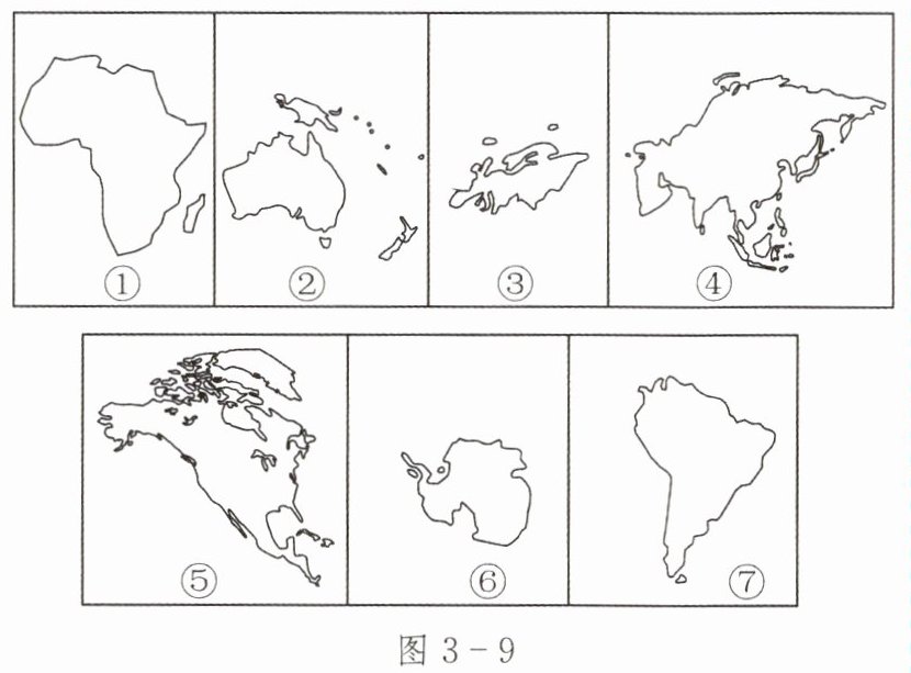 某学生在学习七大洲的知识时,为加深印象,描出了七大洲的轮廓(图3-9)。读图,完成3~4题。