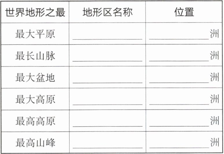 (1)海平面 垂直距离 高度差 (2)形态 山地 盆地 平原 (3)①小 高 500 低 200 ②高 500 低 500 ③山地 高原 (4)亚马孙平原 南美 安第斯山脉 南美 刚果盆地 非 巴西高原 南美 青藏高原 亚 珠穆朗玛峰 亚 (5)①太平洋沿岸 ②亚欧大陆 非洲