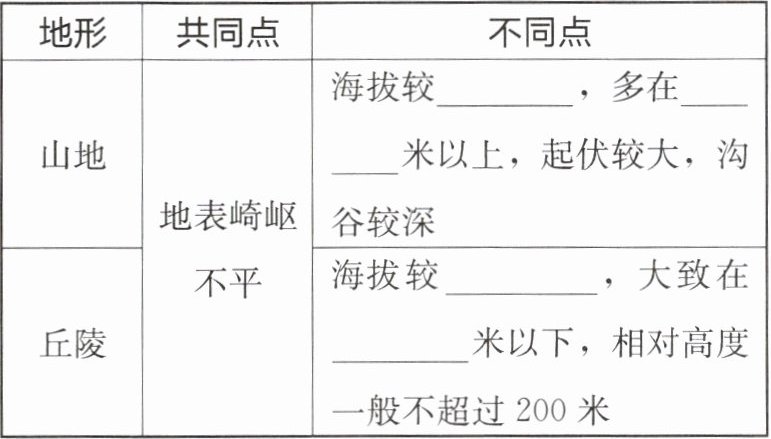 |山地|地表崎岖不平|海拔较______,多在______米以上,起伏较大,沟谷较深|