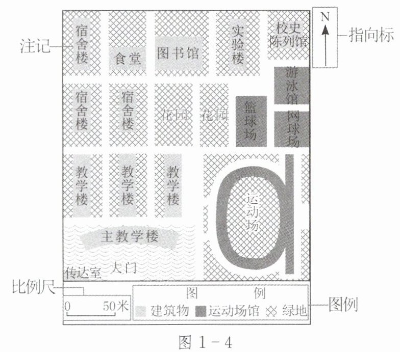 ②有______的地图(图1-4),要根据指向标来确定方向。没有指向标的地图,通常采用“______”的惯例确定方向。