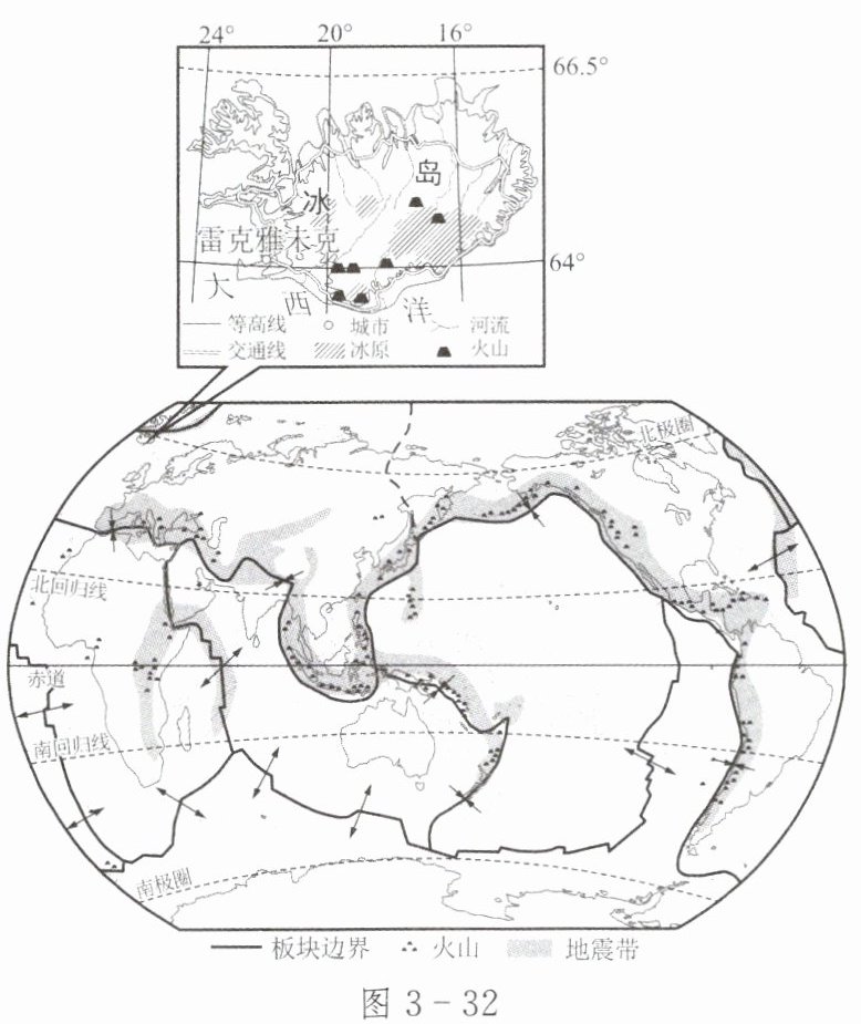 冰岛是位于北大西洋的海岛国家,有“冰火之国”的美誉。境内冰川、温泉、黑沙滩、火山地貌等资源丰富,吸引着世界各地的游客,旅游业已成为该国的支柱产业。图3-32为全球六大板块与主要火山、地震带分布图。读图,完成7~8题。