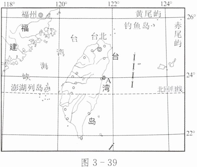 (2023年内蒙古通辽)2022年9月18日,台湾省花莲县(A点)发生6.9级地震,震源深度10千米,给当地造成较大损失。图3-39为台湾省简图。读图,完成4~5题。