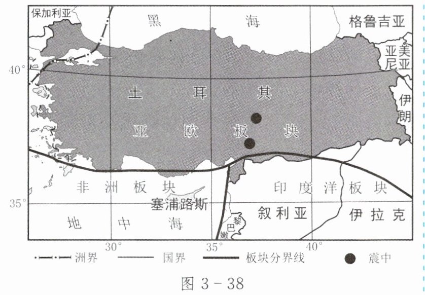 (2023年四川雅安)2023年2月,土耳其一日内发生两次7级以上地震,震中位于山区,震中附近城市、人口密集,地震造成巨大的经济损失和人员伤亡。图3-38为土耳其位置示意图。读图,完成1~3题。