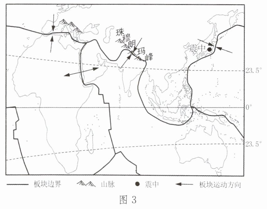 中国科学院的古植物科考队在珠穆朗玛峰附近海拔 5 800 米区域发现了距今 1 500 万年的植物化石。它们分别为高山栎叶片和木贼地下块茎化石,而这些植物不可能分布在如此高海拔的地区。图 3 为部分板块分布示意图。读图,完成 5~6 题。