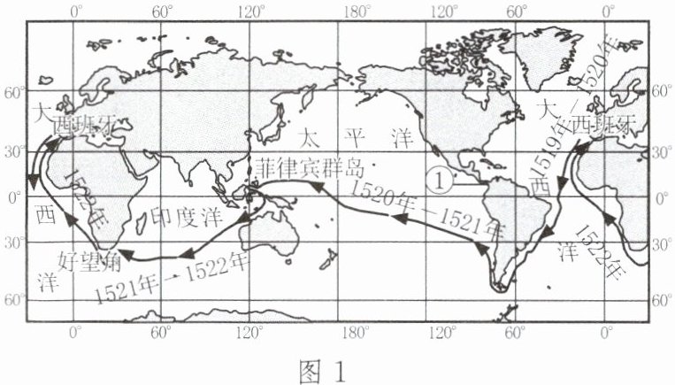 图 1 为麦哲伦船队环球航行路线示意图。读图,完成 1~2 题。