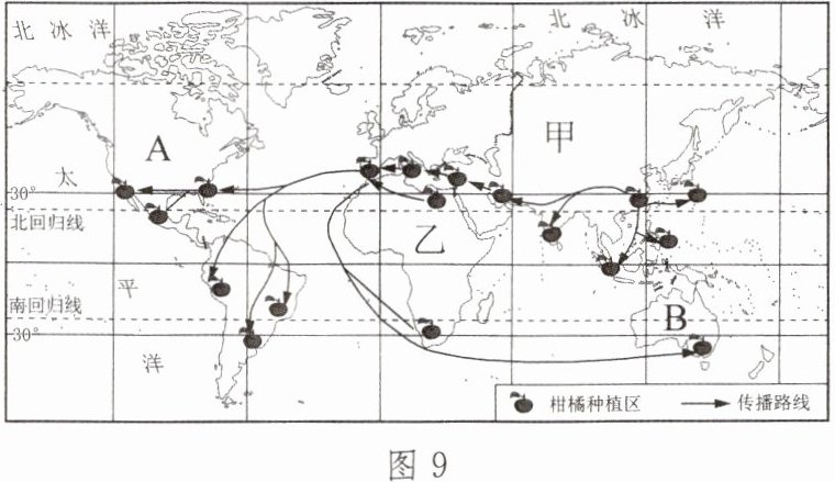 (1)柑橘从我国传播到世界各地,其中传播到的大洲 A 是______,B 是______。