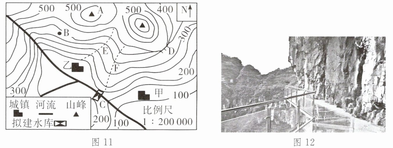 材料 某中学组织学生前往某地区乡村开展研学活动。图 11 为该地等高线地形图,图 12 为玻璃栈道景观图。