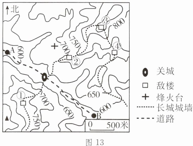 材料 长城是中国古代军事防御工程,由城墙、敌楼、关城、烽火台等多种防御工事组成。图 13 为某地长城景区等高线地形图。