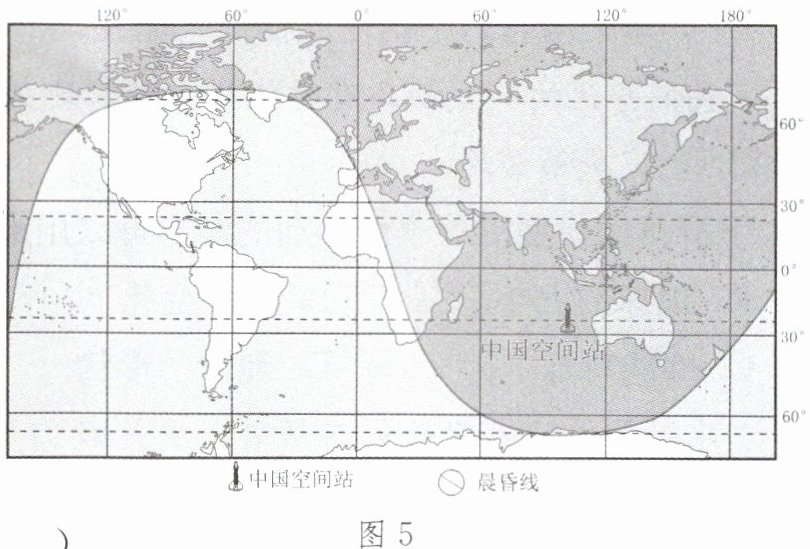 空间站是一种在近地轨道长时间运行,可供多名航天员巡访、长期工作和生活的大型载人航天器。我国空间站实现自主建造,且以开放的姿态开展国际交流合作。图 5 为 2022 年 11 月 22 日某时刻中国空间站运行于图 5 所示位置上空示意图。读图,完成 8~10 题。