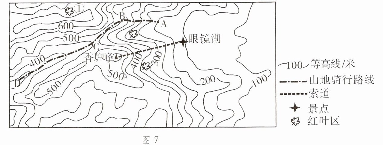 (1)图 8 中③地距④地的实地直线距离约为 350 米,在导游图中量得两地间距离约为 3.5 厘米,判断图 8 的比例尺约为______。图 8 属于______(填“大”或“小”)比例尺地图,表述的内容______(填“详细”或“简略”),描述范围______(填“大”或“小”)。