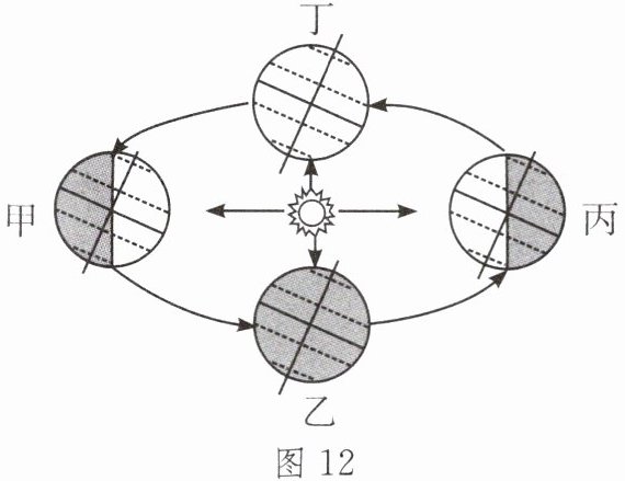 (2)图 11 演示的日期对应图 12 中的______(填“甲”“乙”“丙”或“丁”),此时为北半球的______季,太阳光直射______,北半球昼夜状况为______。