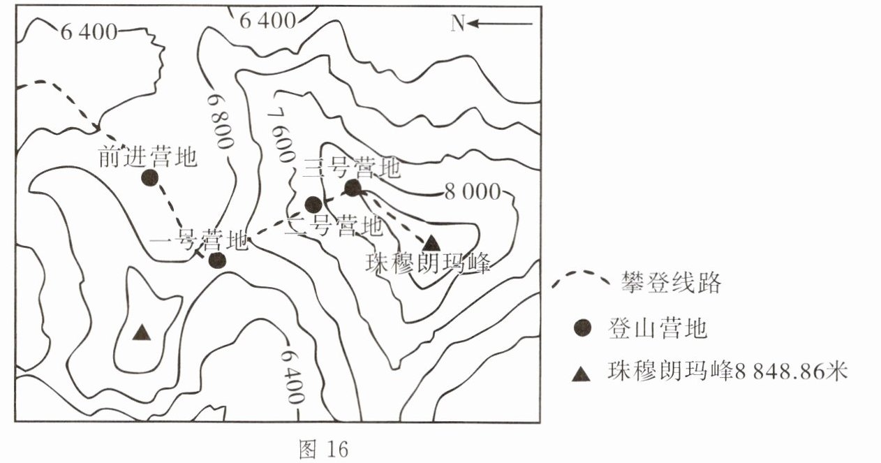 材料三 我国 2020 年珠峰高程测量登山队于 5 月 27 日成功登上珠穆朗玛峰,图 16 为珠峰高程测量登山队登山路线及周边等高线地形图。