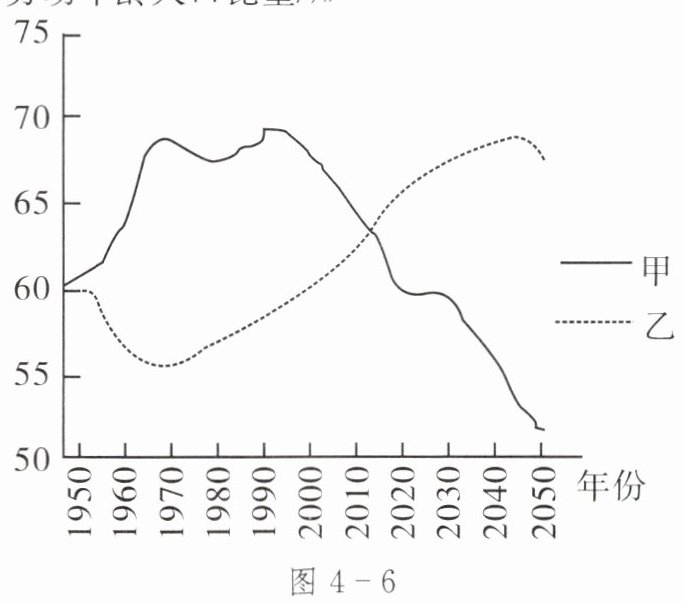 图4-6为甲、乙两国劳动年龄人口(15~64岁人口)占比图。读图,完成3~4题。