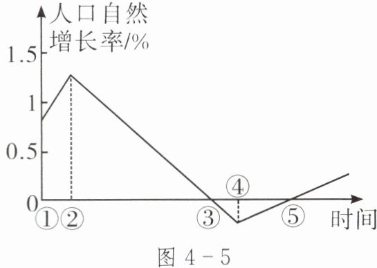 图4-5为某国人口自然增长率随时间变化示意图。读图,完成1~2题。