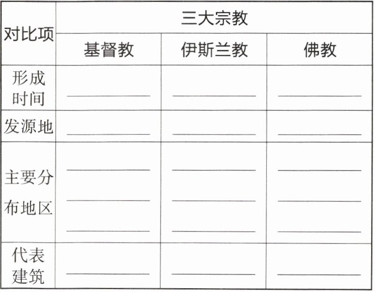 2.公元1世纪 公元7世纪 公元前6世纪 亚洲西部 阿拉伯半岛 古印度 欧洲、北美洲、南美洲及大洋洲 亚洲西部和东南部、非洲北部和东部 亚洲的东部和东南部 教堂 清真寺 佛塔