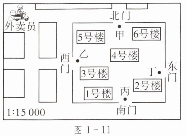 1. 外卖员要去该小区2号楼送餐,当骑行至图1-11中的位置时,与2号楼的图上距离为5厘米,其实地距离是( )。