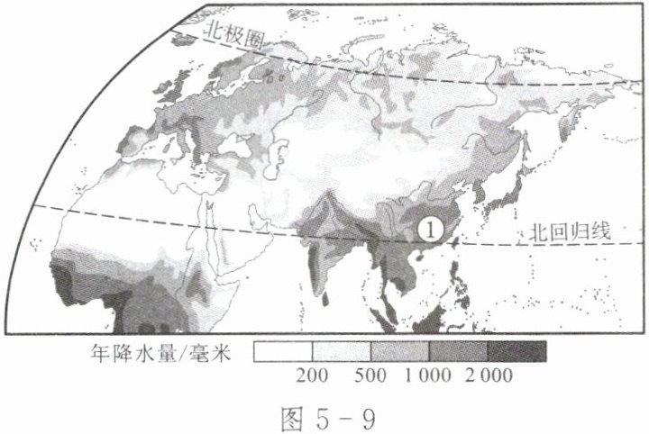 图5-9为世界局部地区年降水量分布图。读图,完成5~7题。