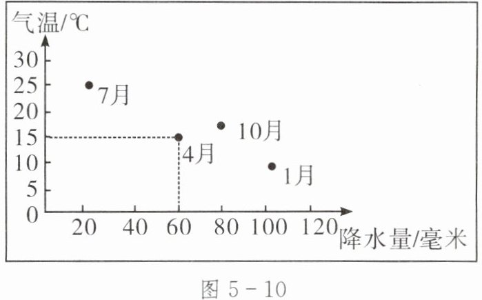 图5-10为某地气温和降水量统计图(如:4月气温为15℃,降水量为60毫米)。据此,完成8~10题。
