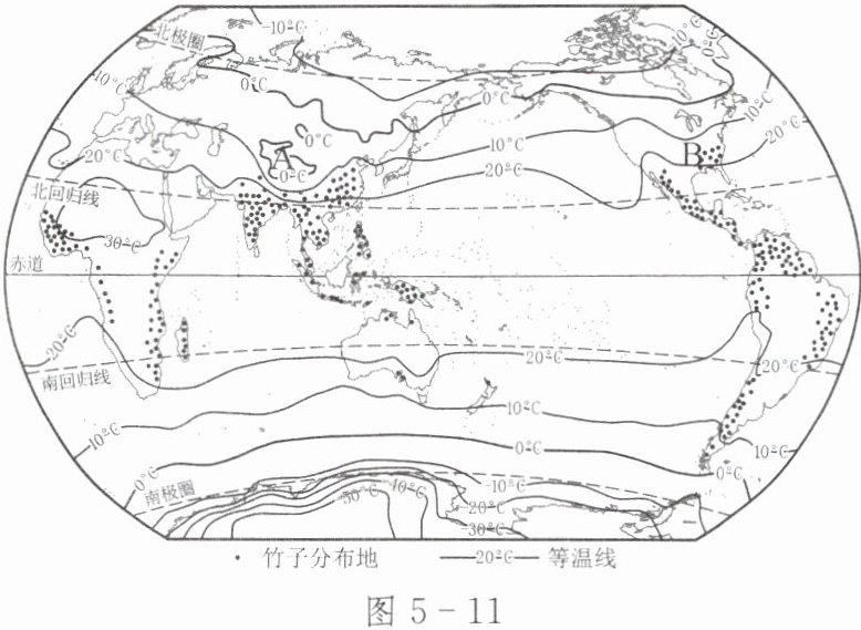 11. 图5-11为世界年平均气温及竹子分布图。读图,完成下列各题。