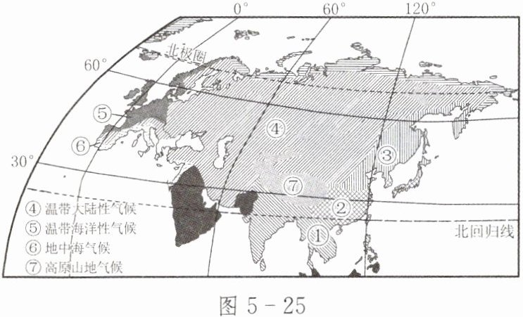 6. 某地理学习小组探究亚欧大陆气候类型分布特点,归纳影响气候空间分布的主要因素。结合图 5 - 25,完成下列各题。