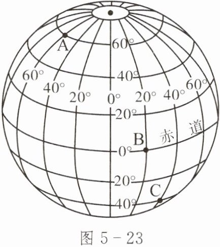 (1) 图 5 - 23 中的 A 点位于图 5 - 24 中的____带,C 点位于____带,A、B、C 三点中有太阳光直射的是____。